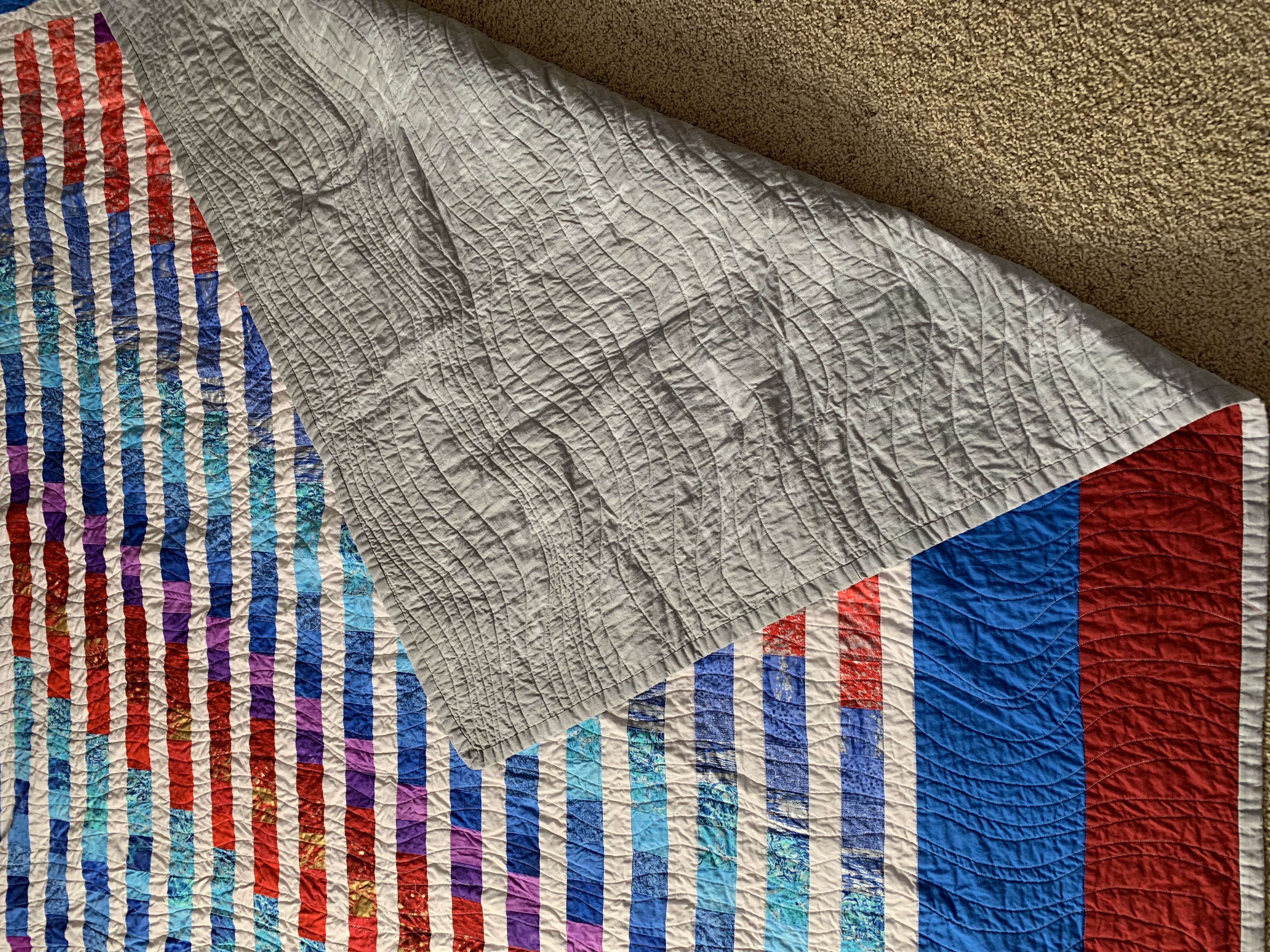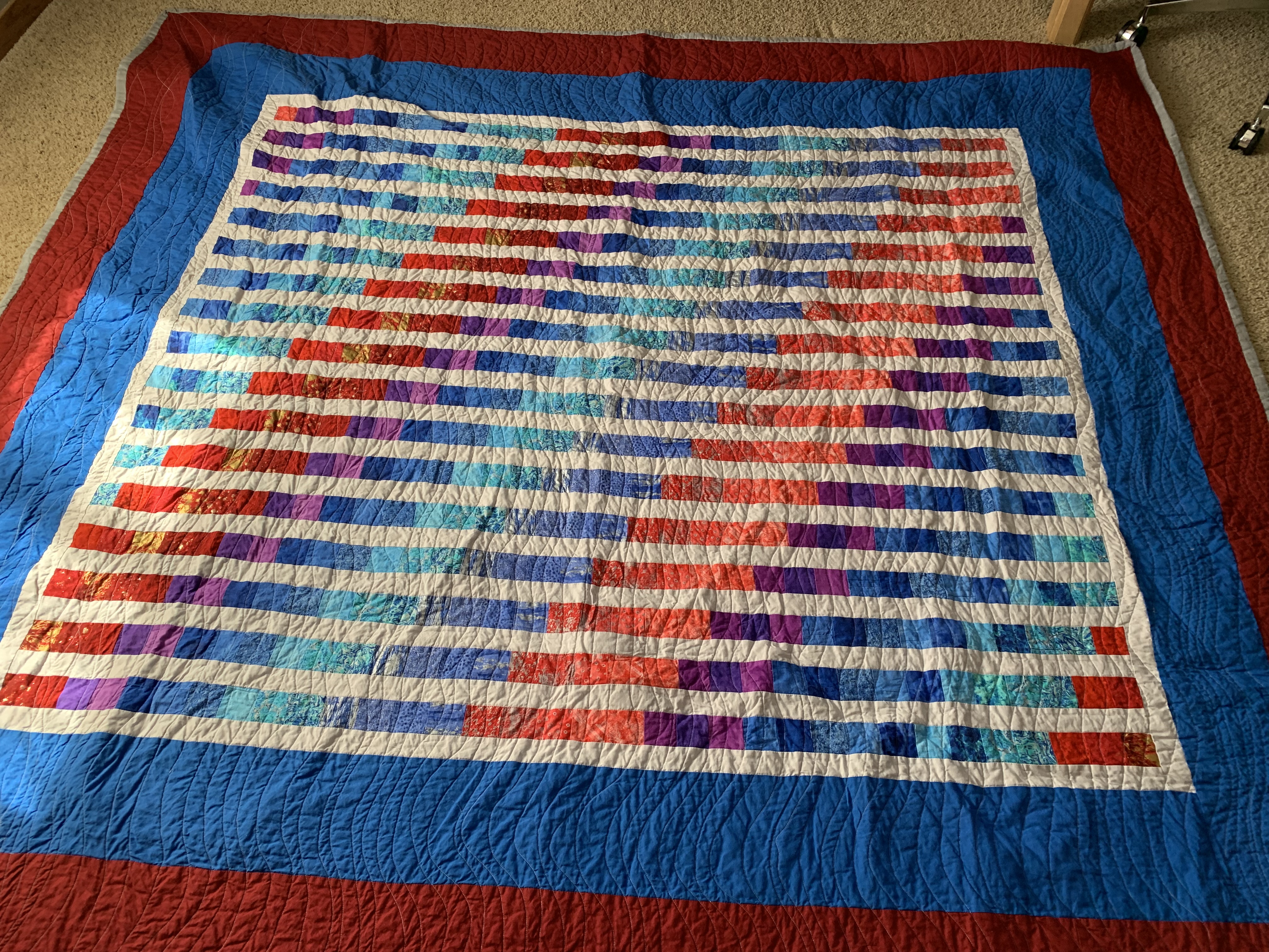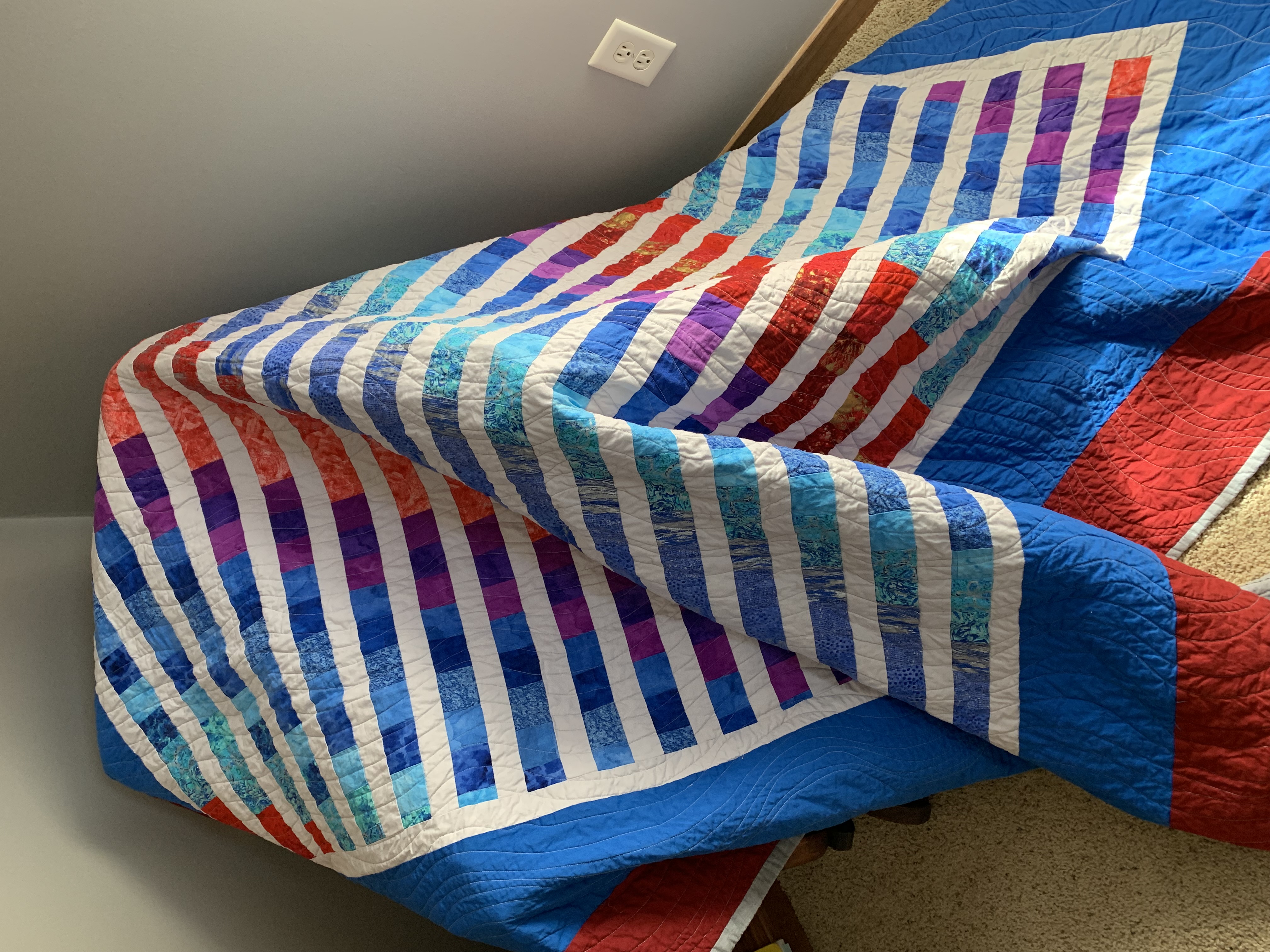 Reminiscent of the flag, this quilt utilizes a modified Bargello technique to weave blues, purples and red together, interspersed with light gray. This quilt is just a little shy of being queen size.