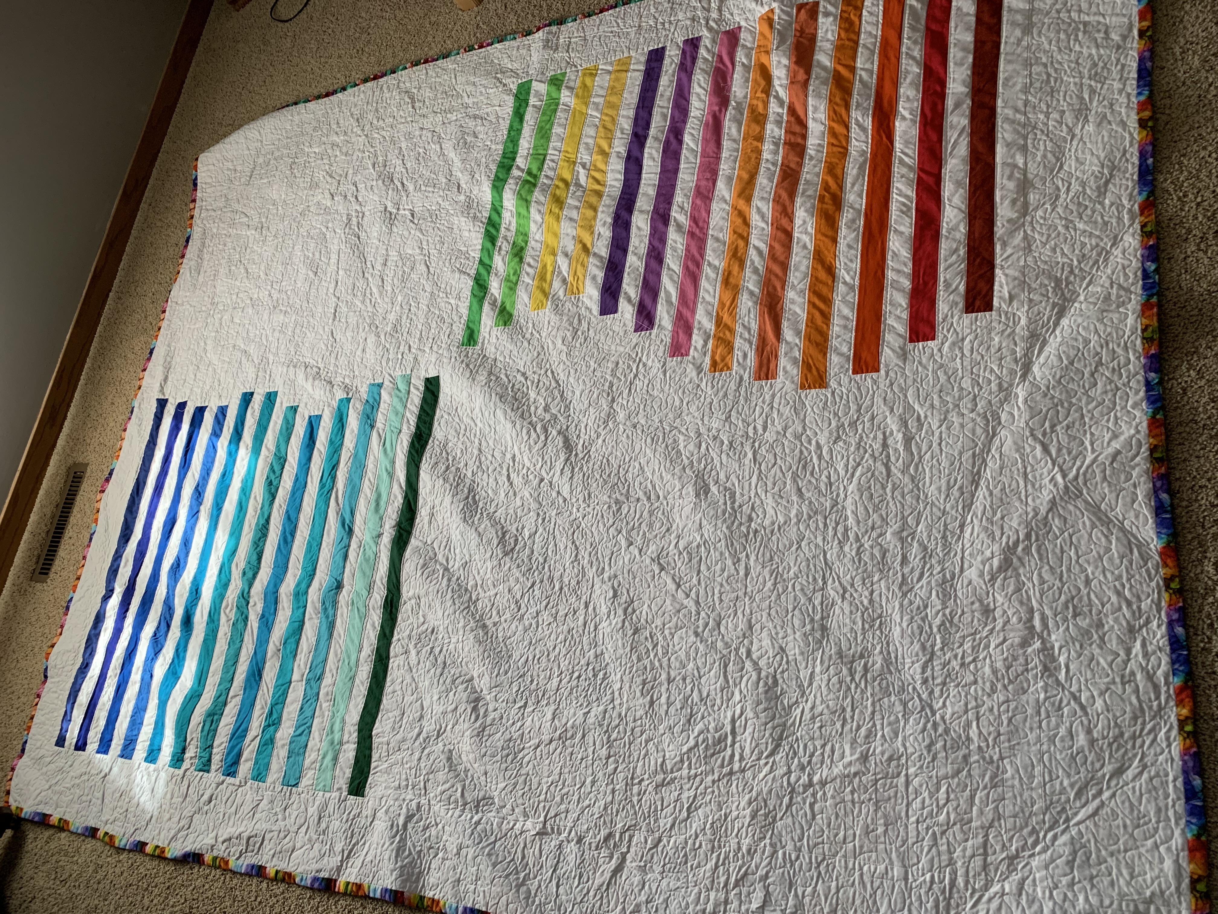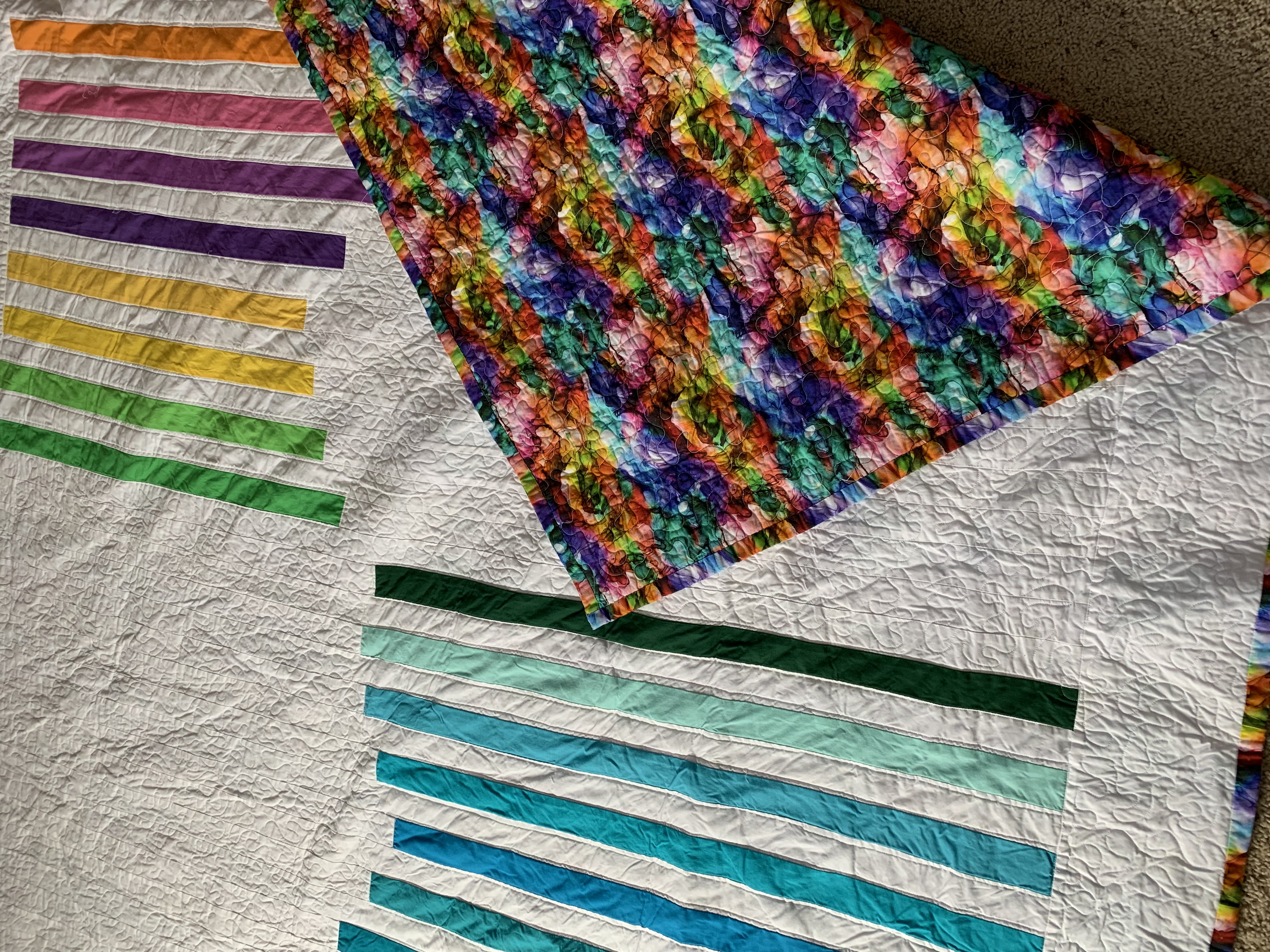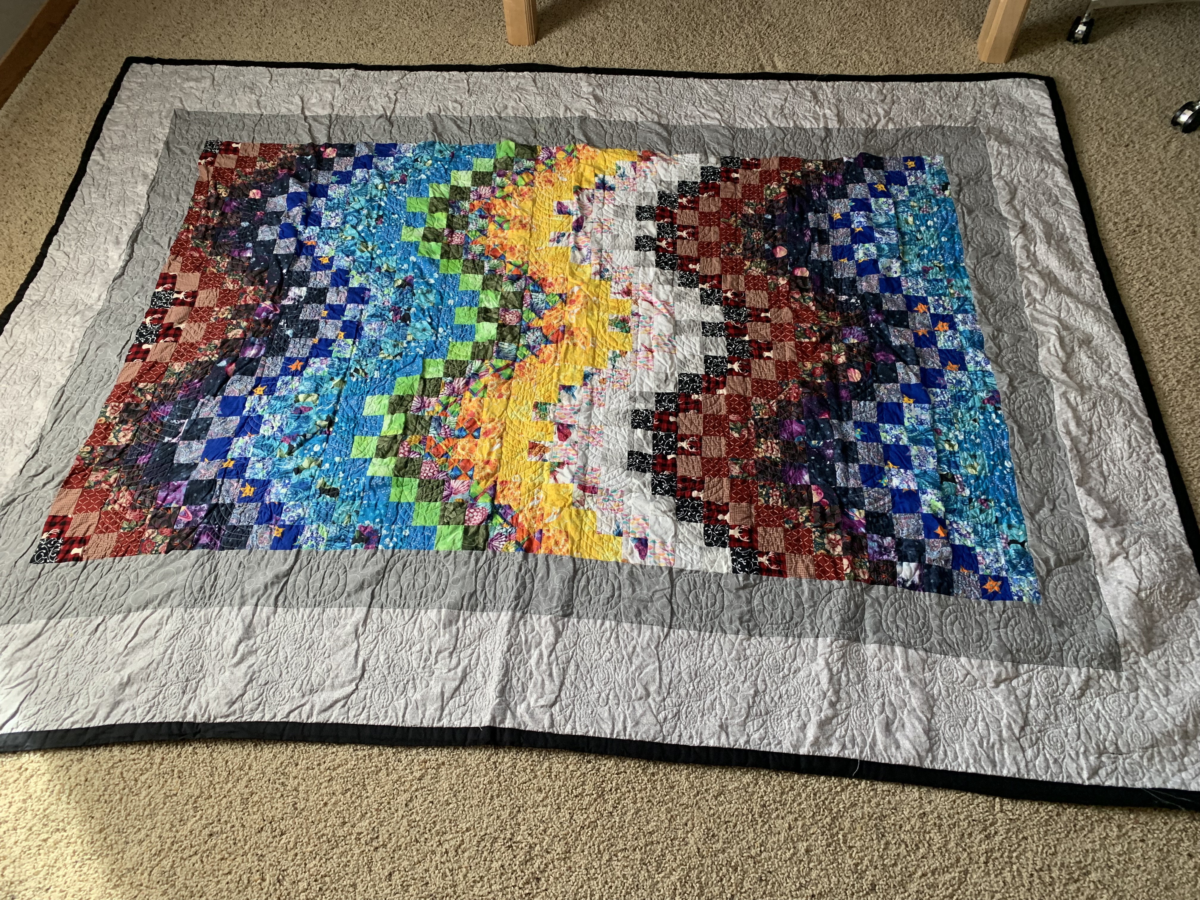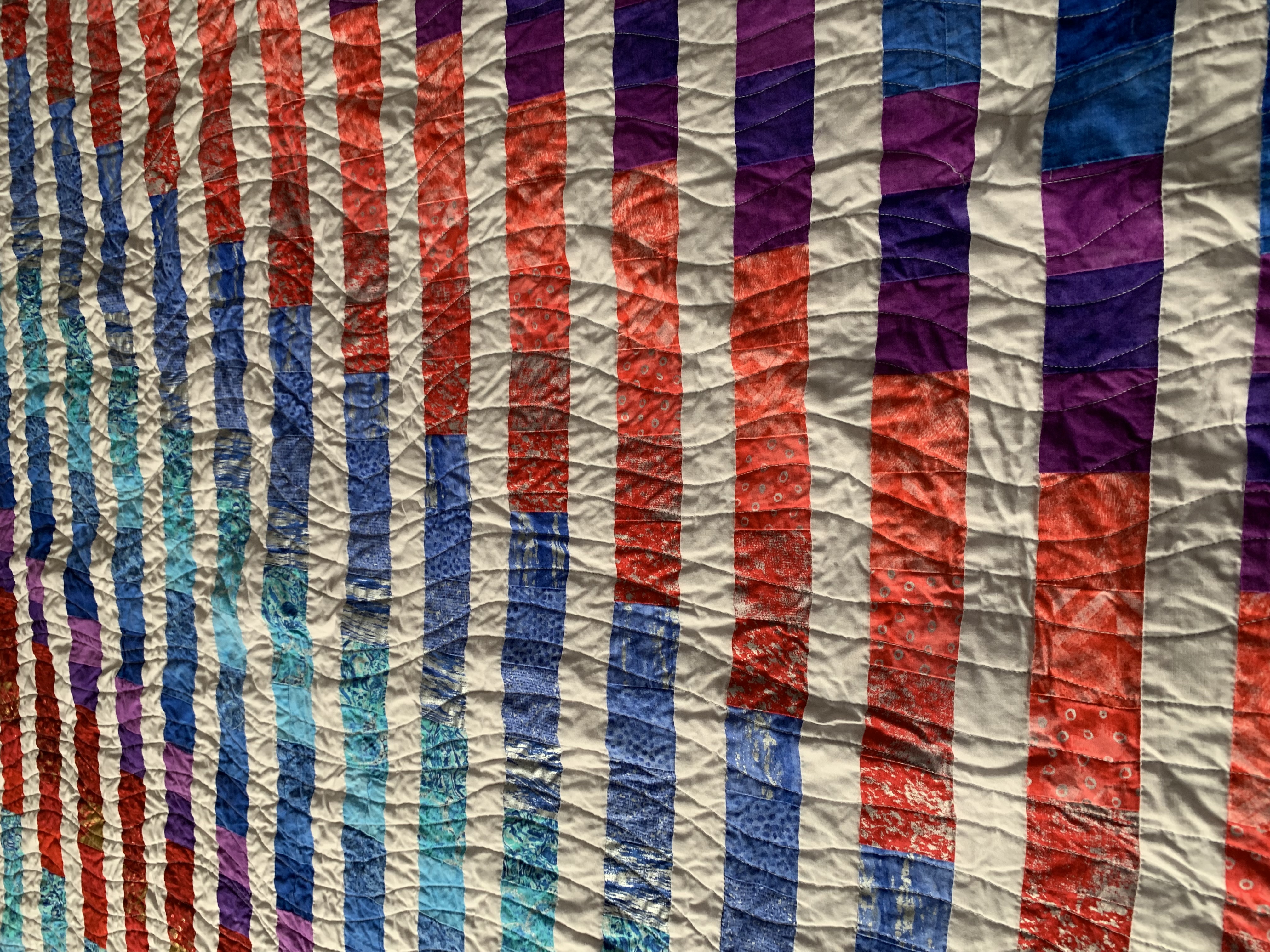 Reminiscent of the flag, this quilt utilizes a modified Bargello technique to weave blues, purples and red together, interspersed with light gray. This quilt is just a little shy of being queen size.
