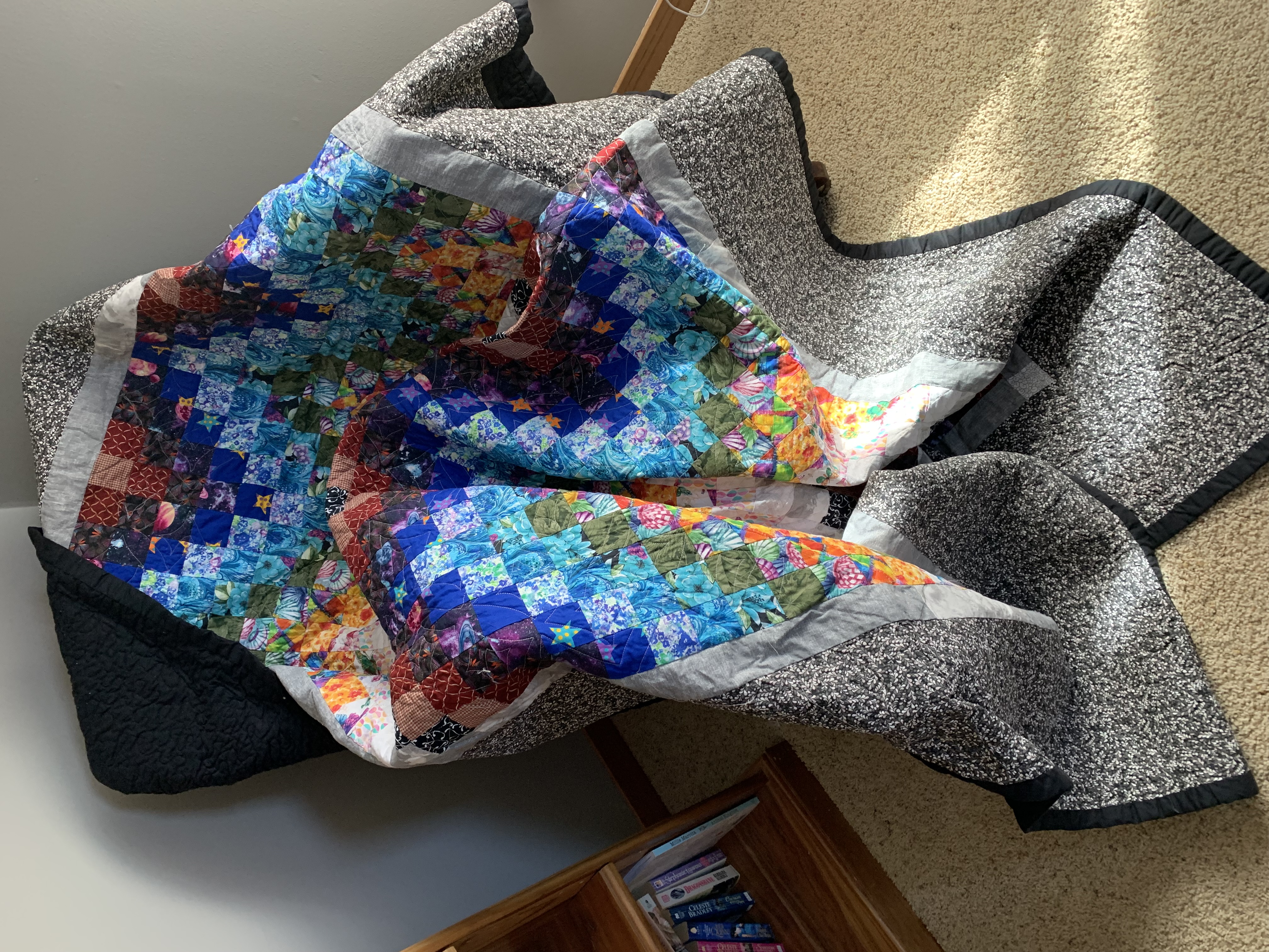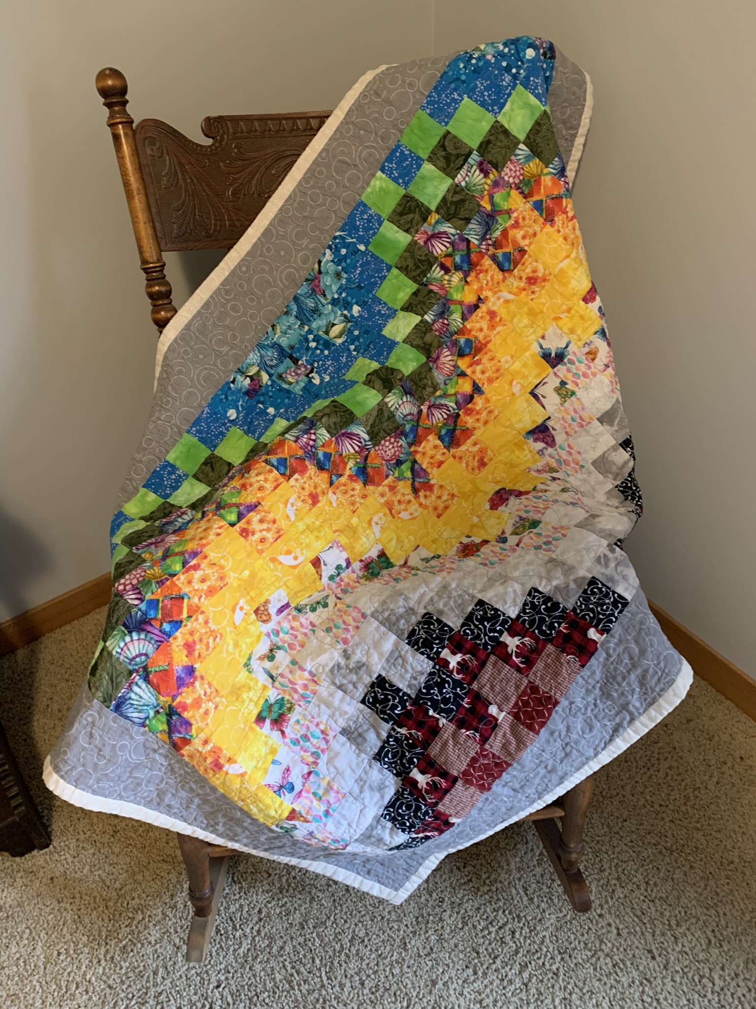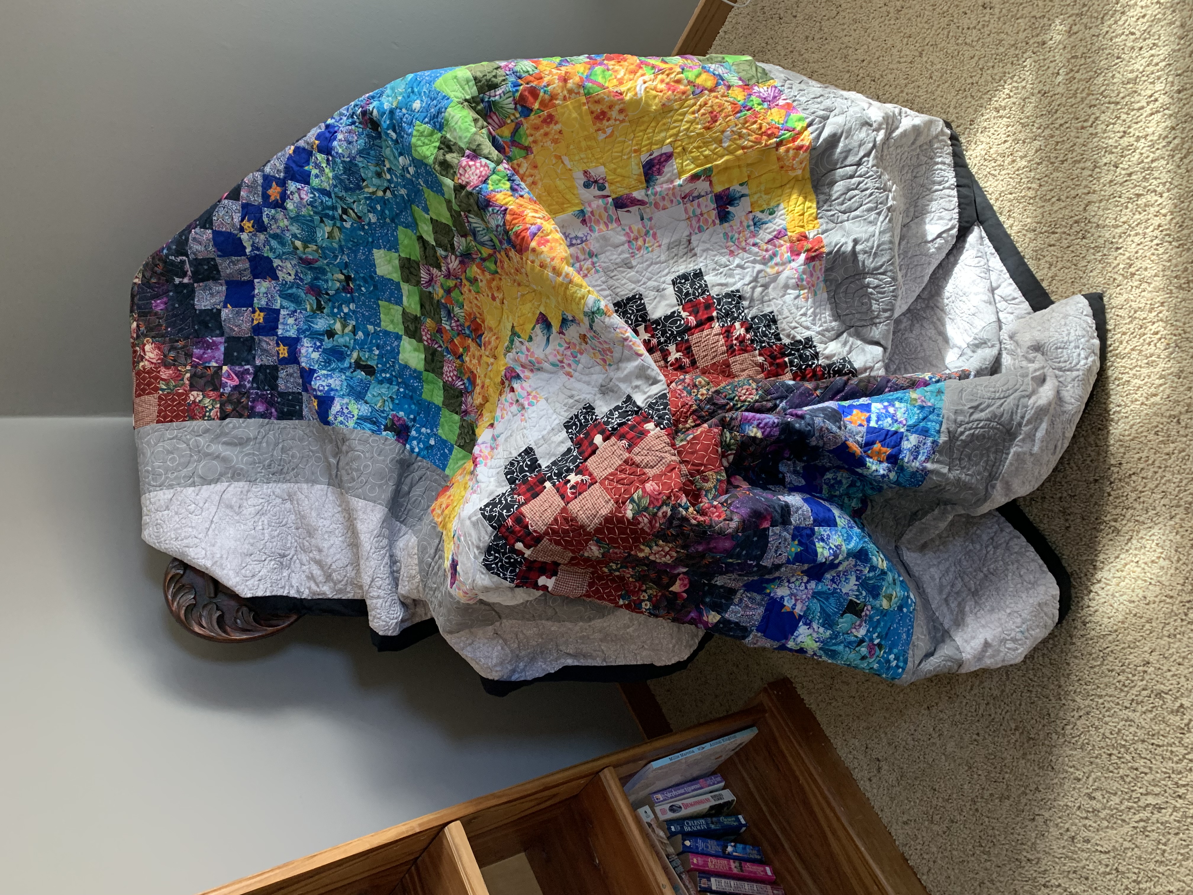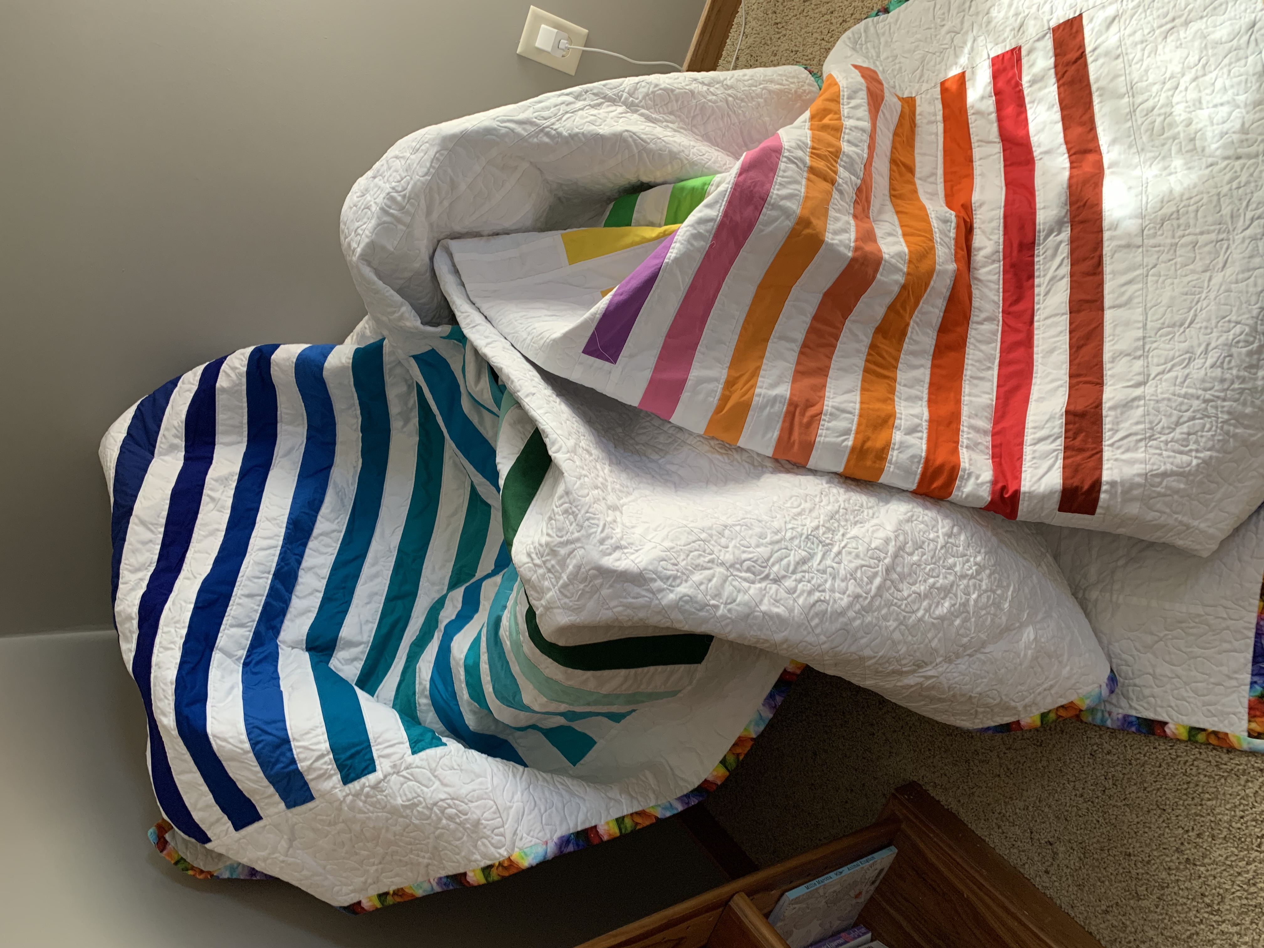 This bright and happy quilt mimics the temperatures that we experience in Minnesota! The Kona cotton fabrics in the top quilt, the cotton batting and wild backing makes it so comfy! This quilt is just a little shy of being queen size.