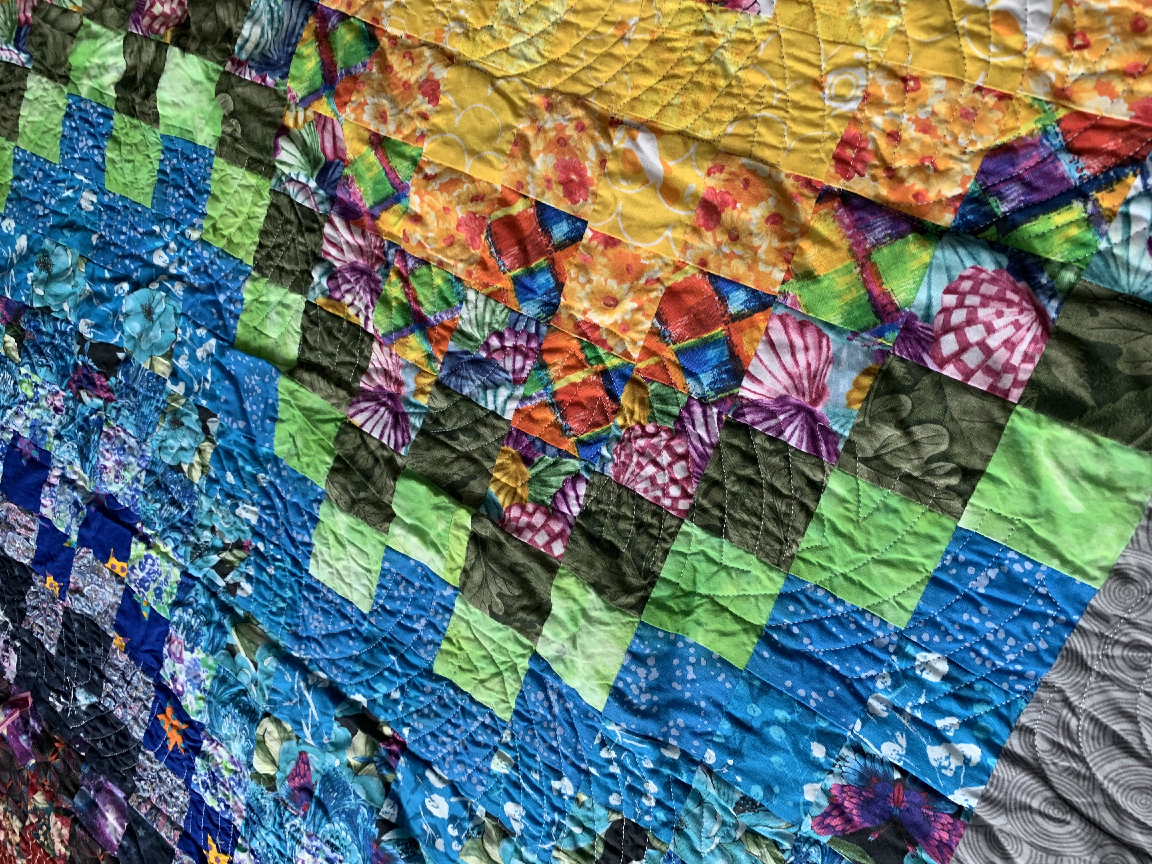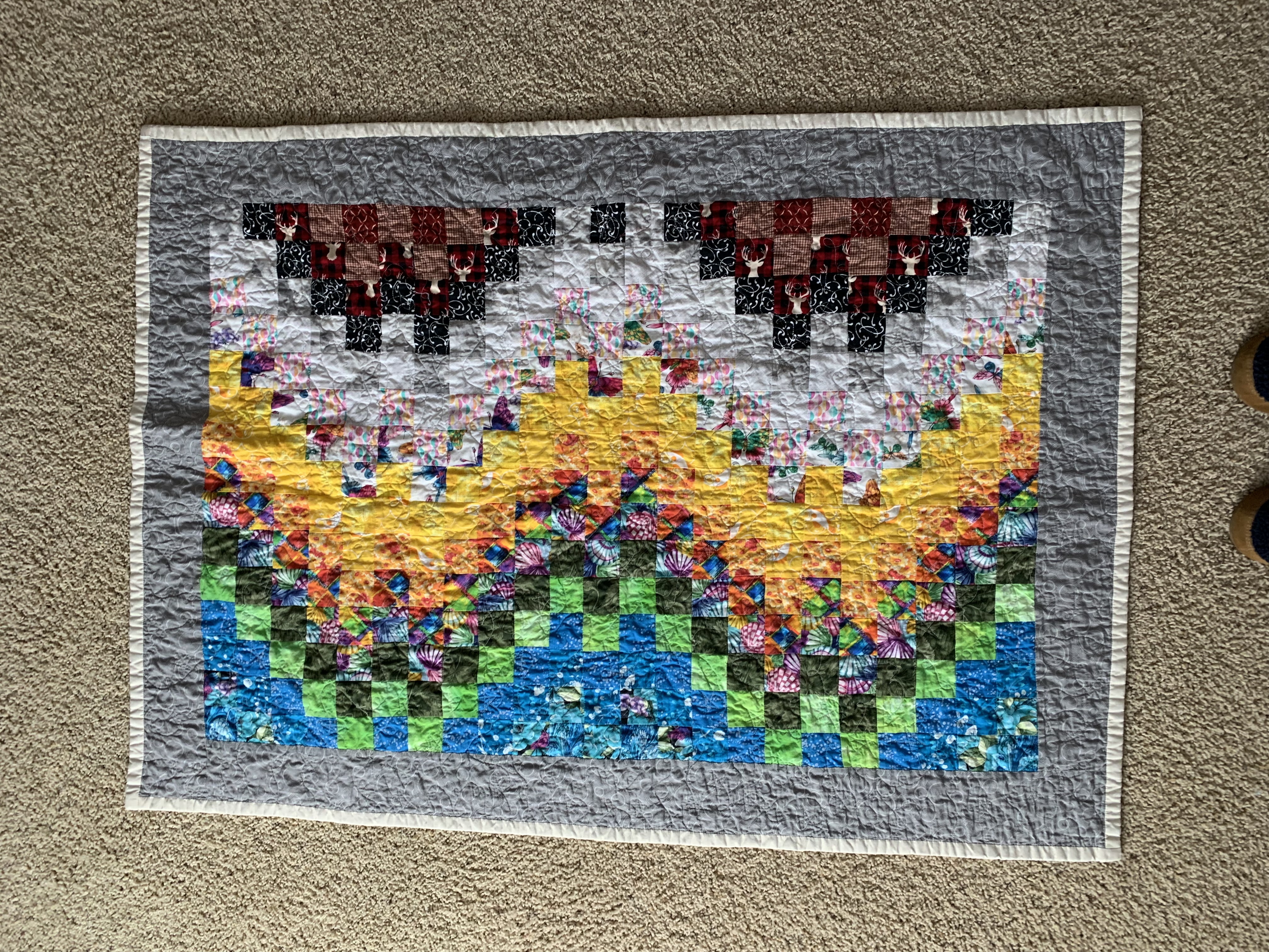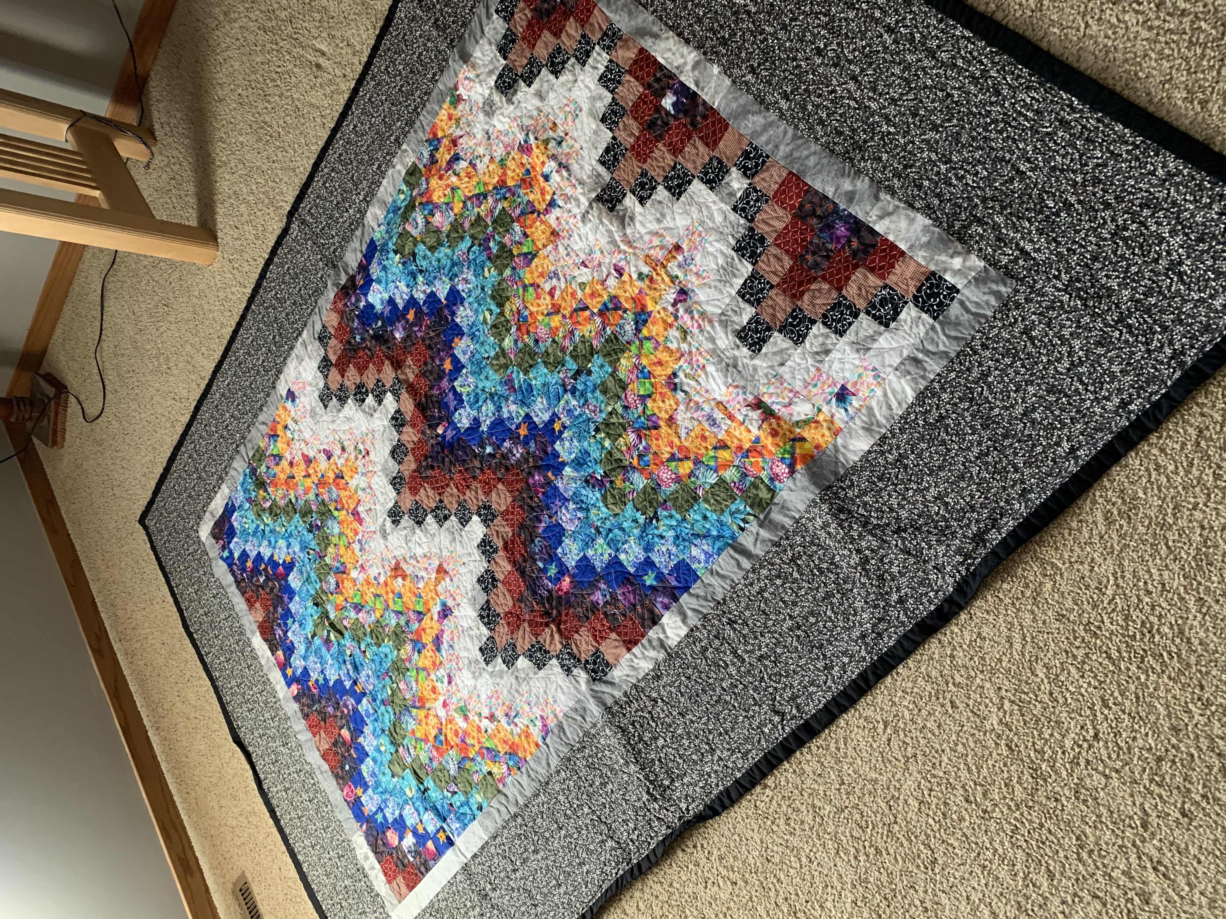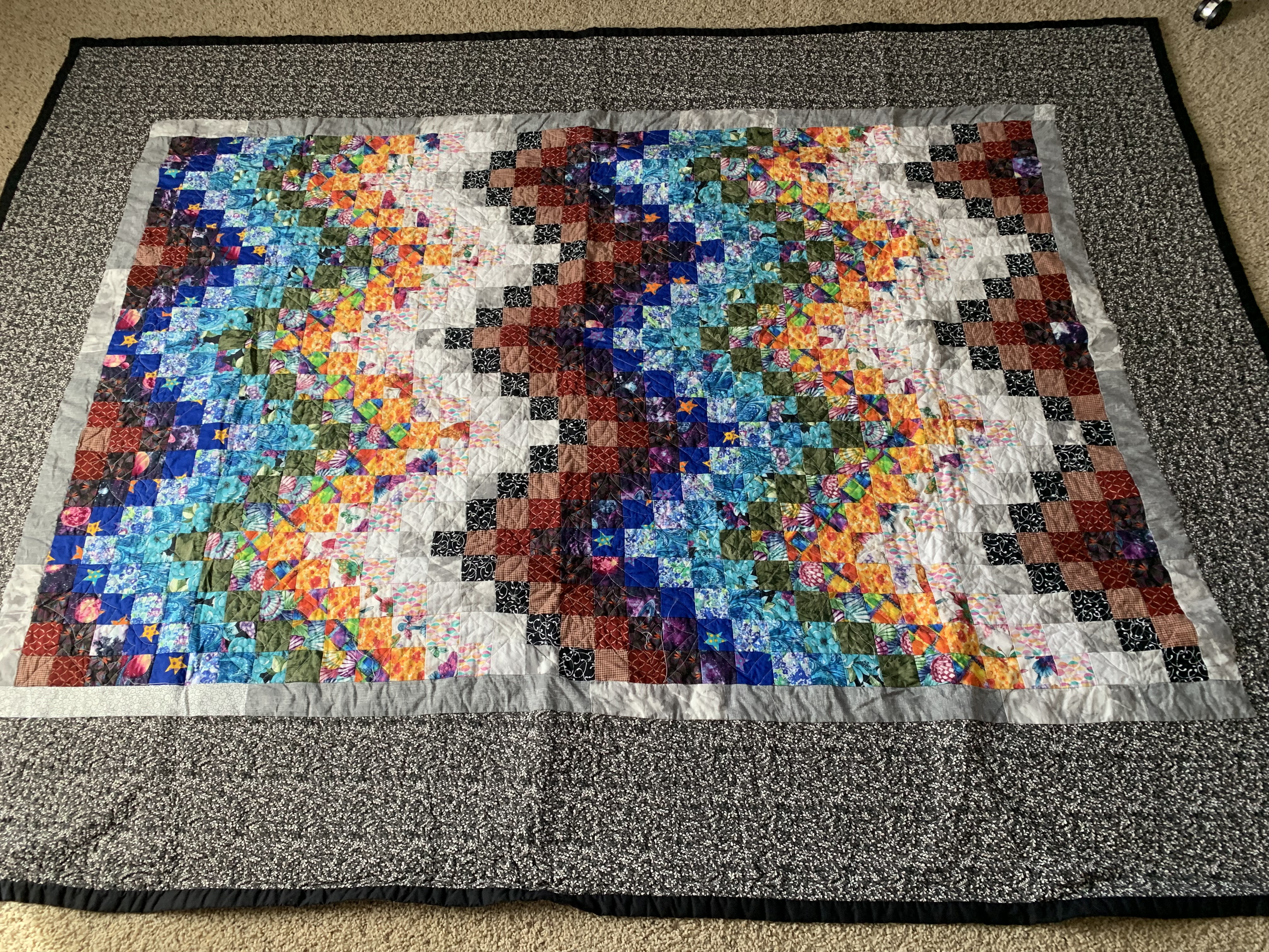 This bright and happy quilt mimics the temperatures that we experience in Minnesota! The Kona cotton fabrics in the top quilt, the cotton batting and wild backing makes it so comfy! This quilt is just a little shy of being queen size.