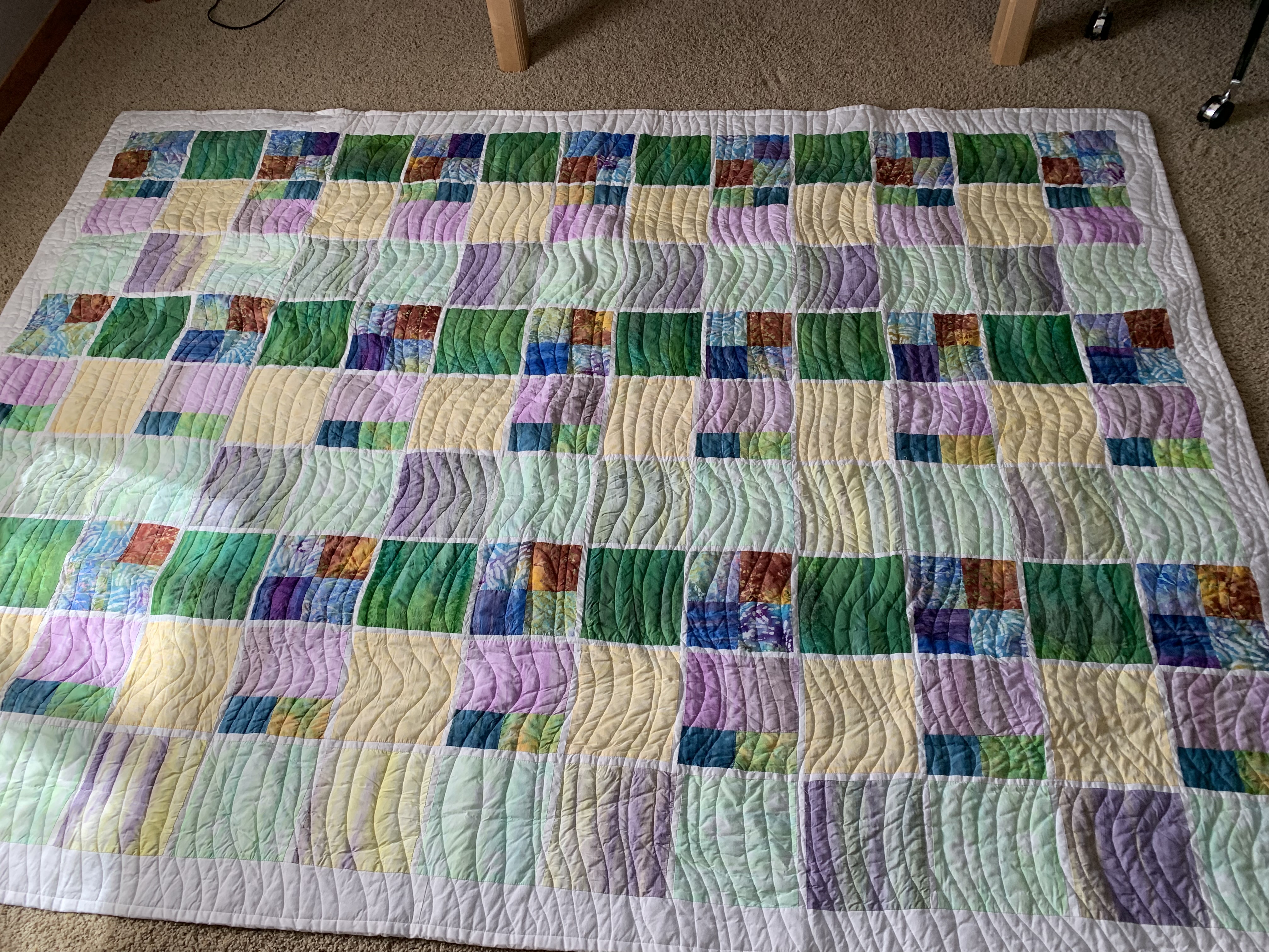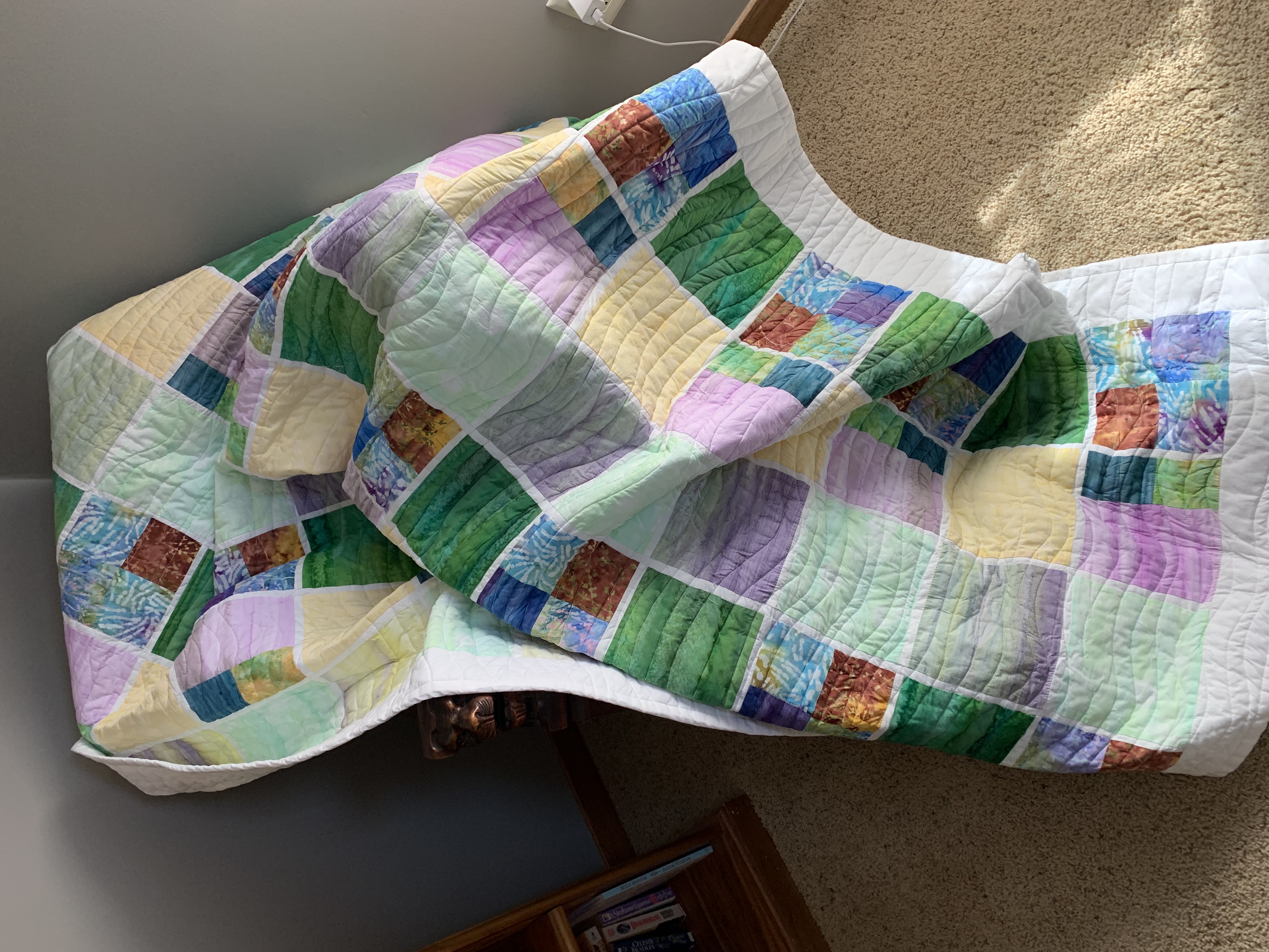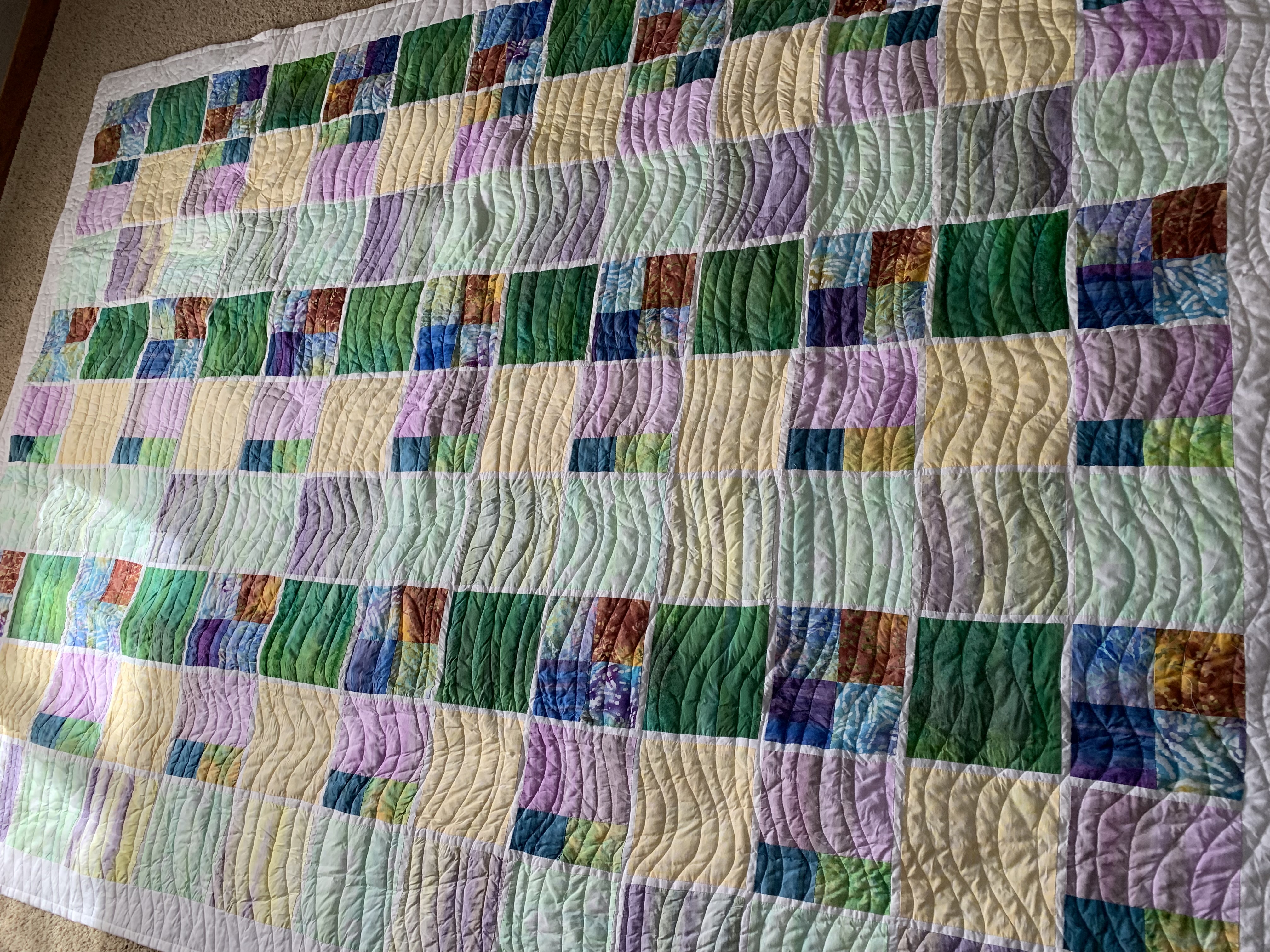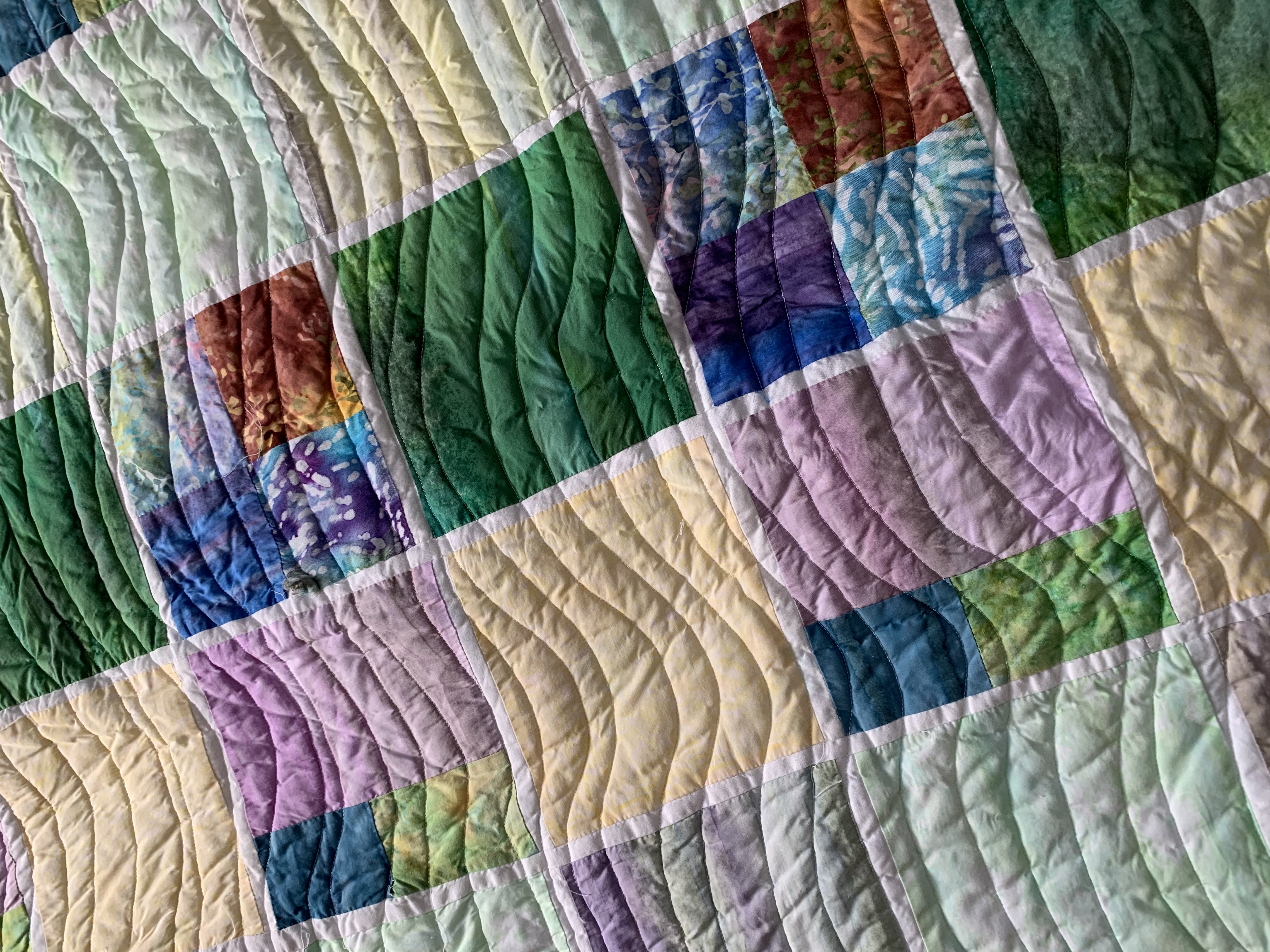 I have four quilts that are all in same batik fabrics and general pattern, with slight variations. All are top quilted with a waving pattern to provide a soft and gentle feel. Three of the four quilts have polyester batting for great draping. One has cotton batting for a warmer feel.