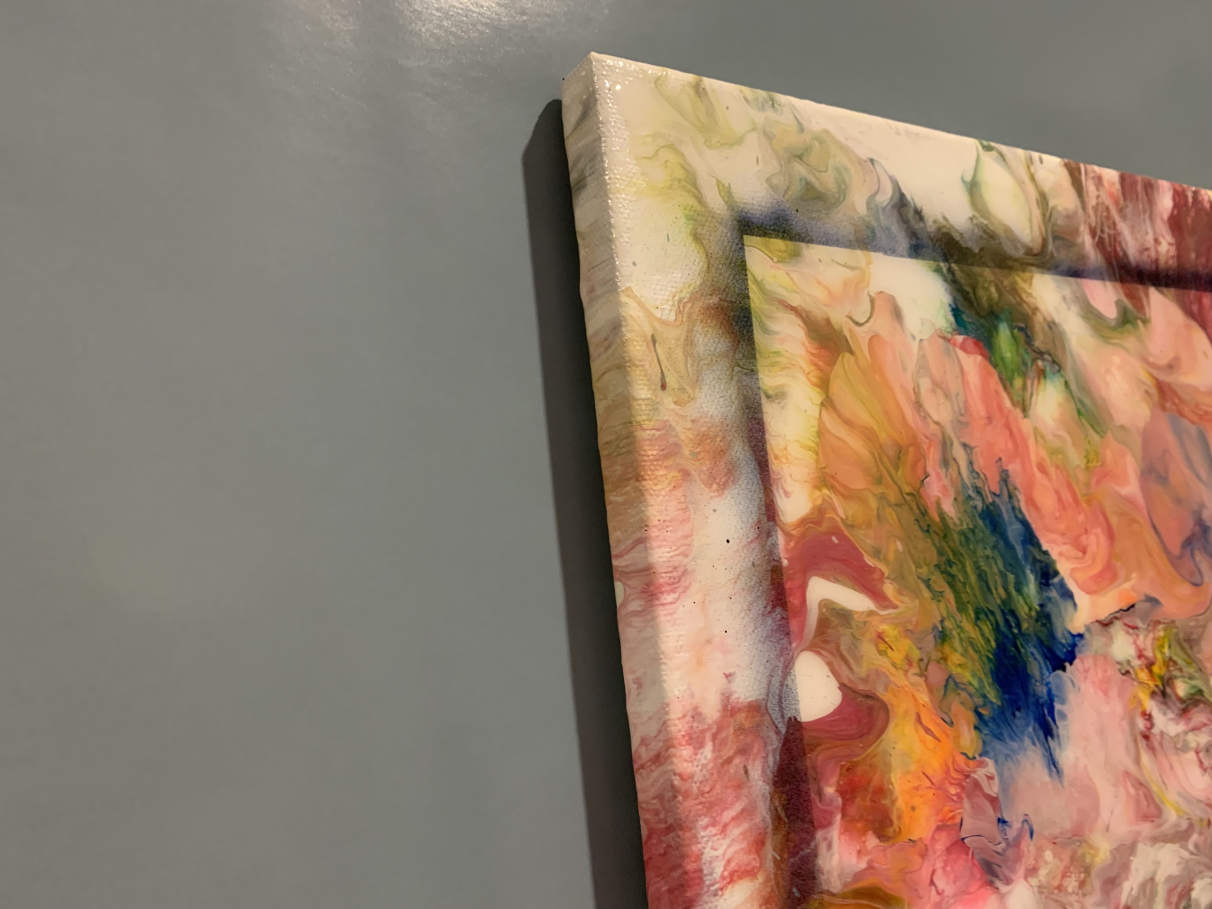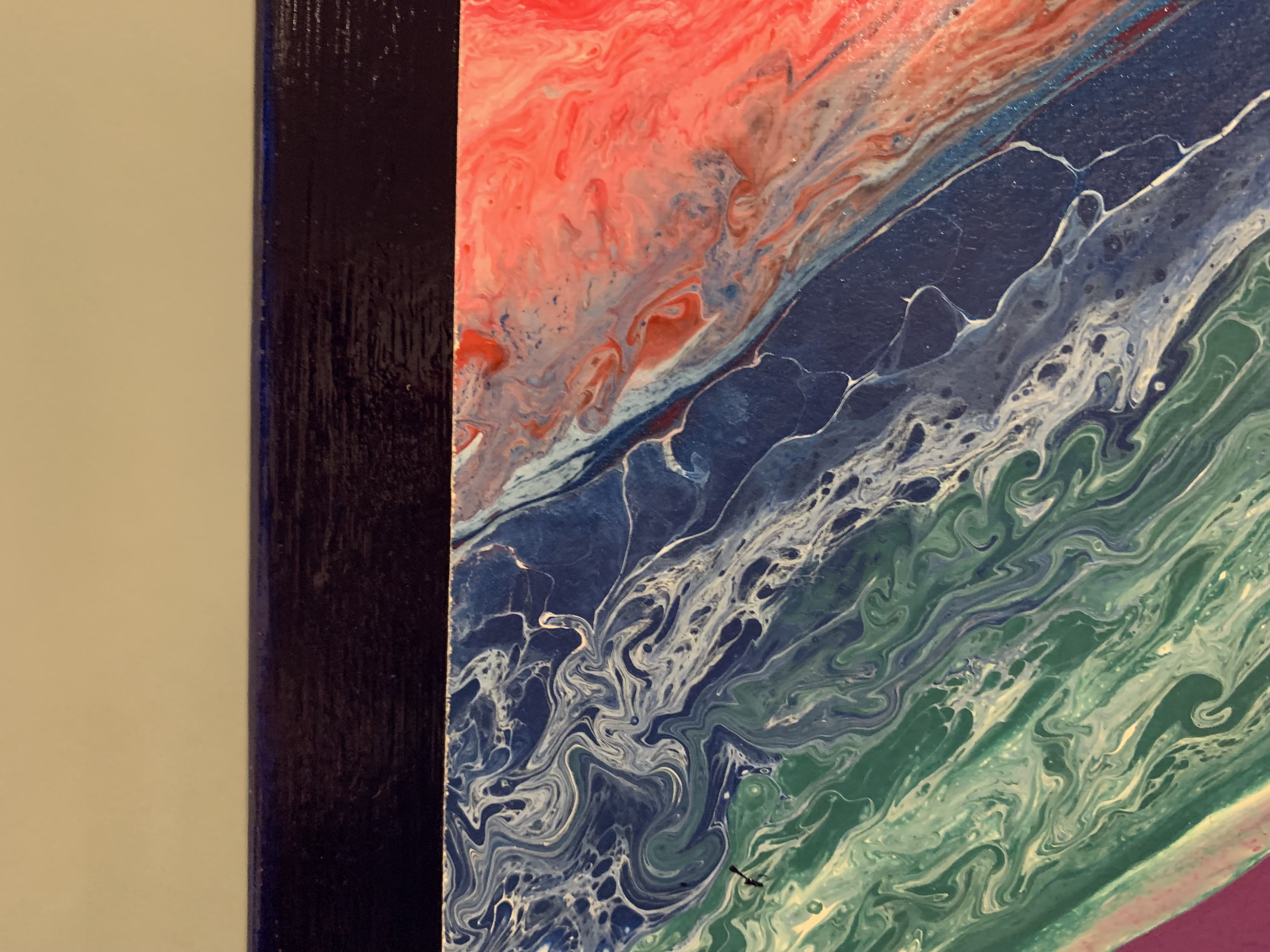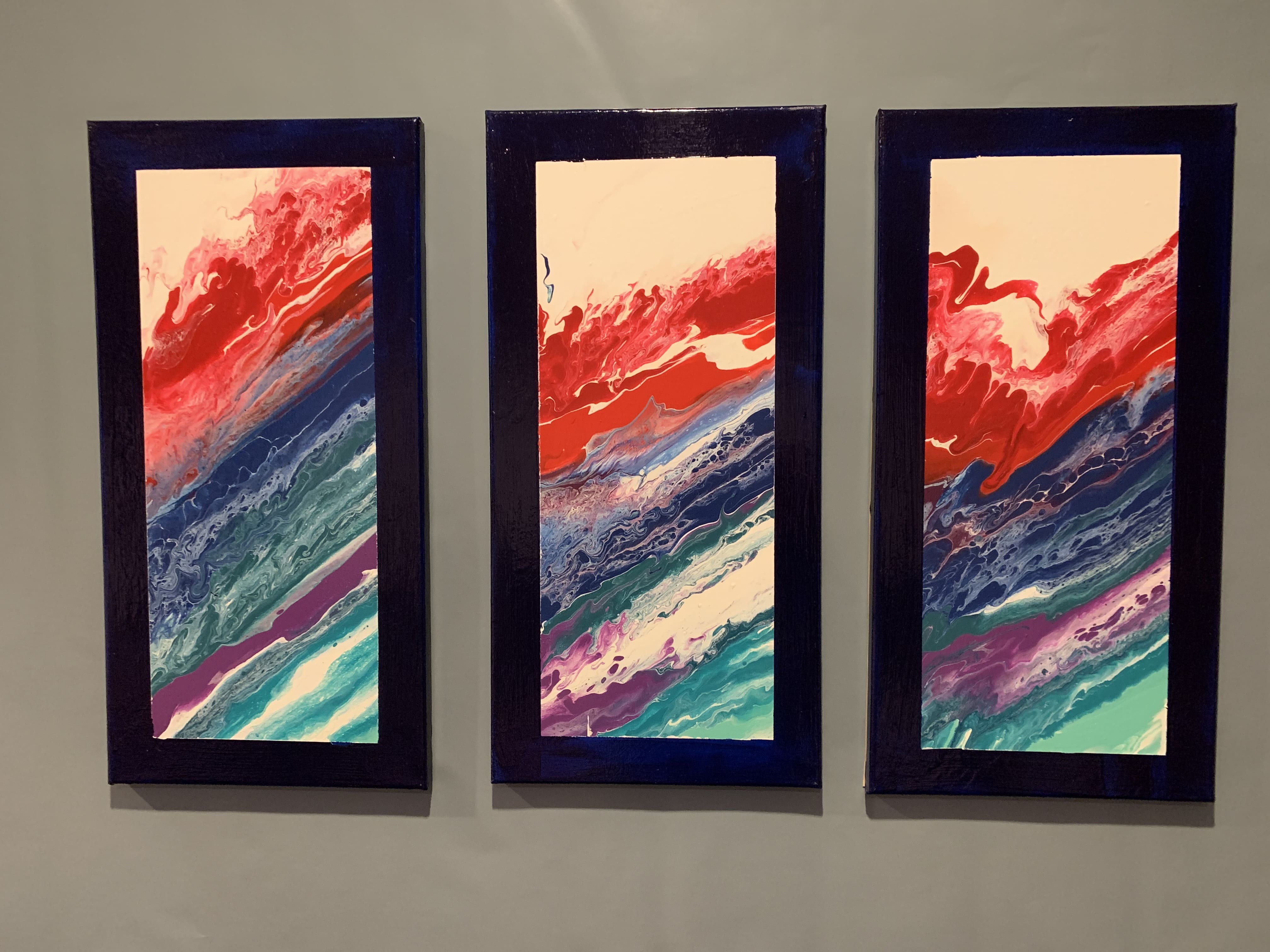 All paintings are on stretched canvas with acrylic base coats and a fluid pour. Sealed with a gloss resin or varnish.