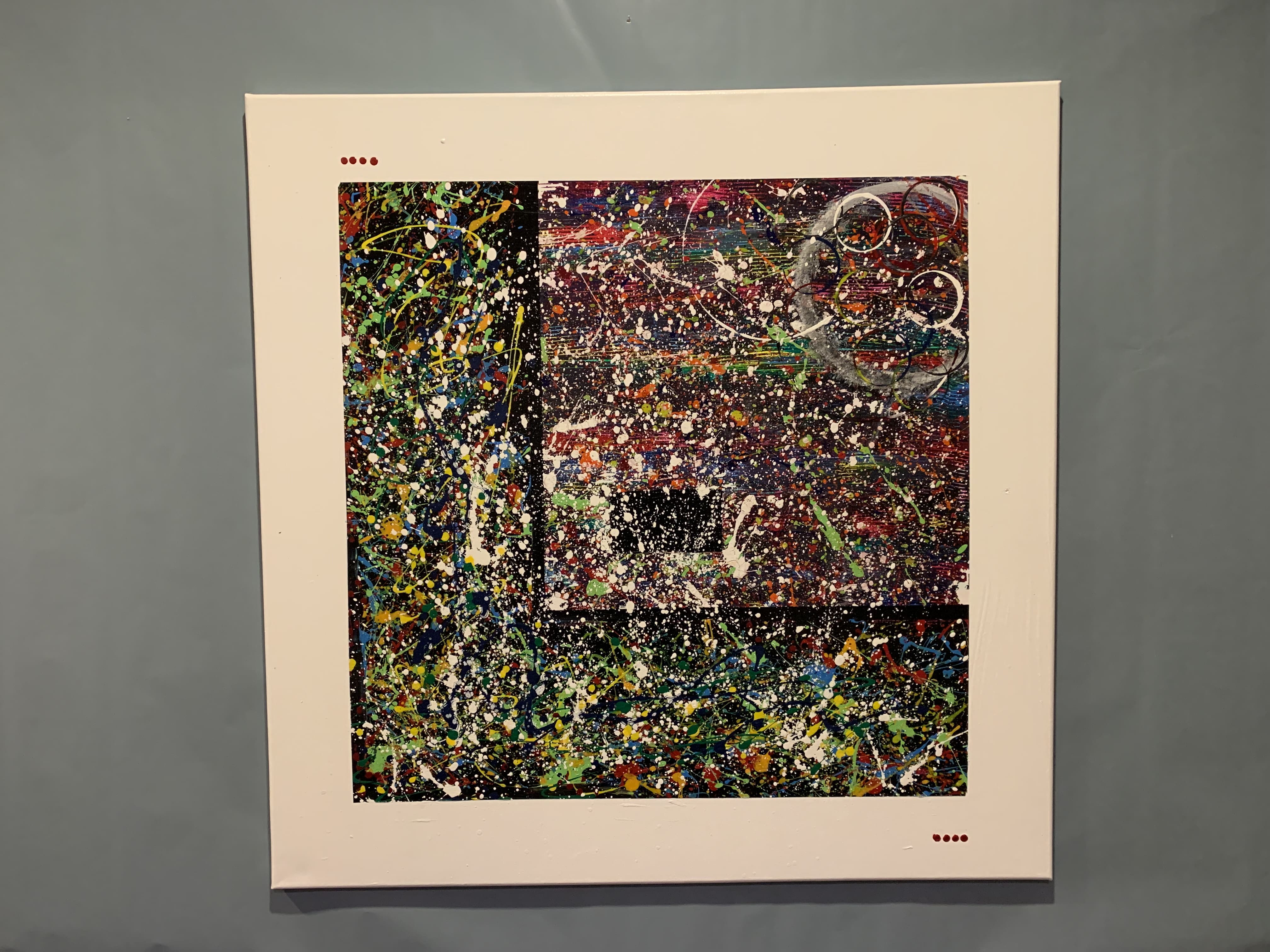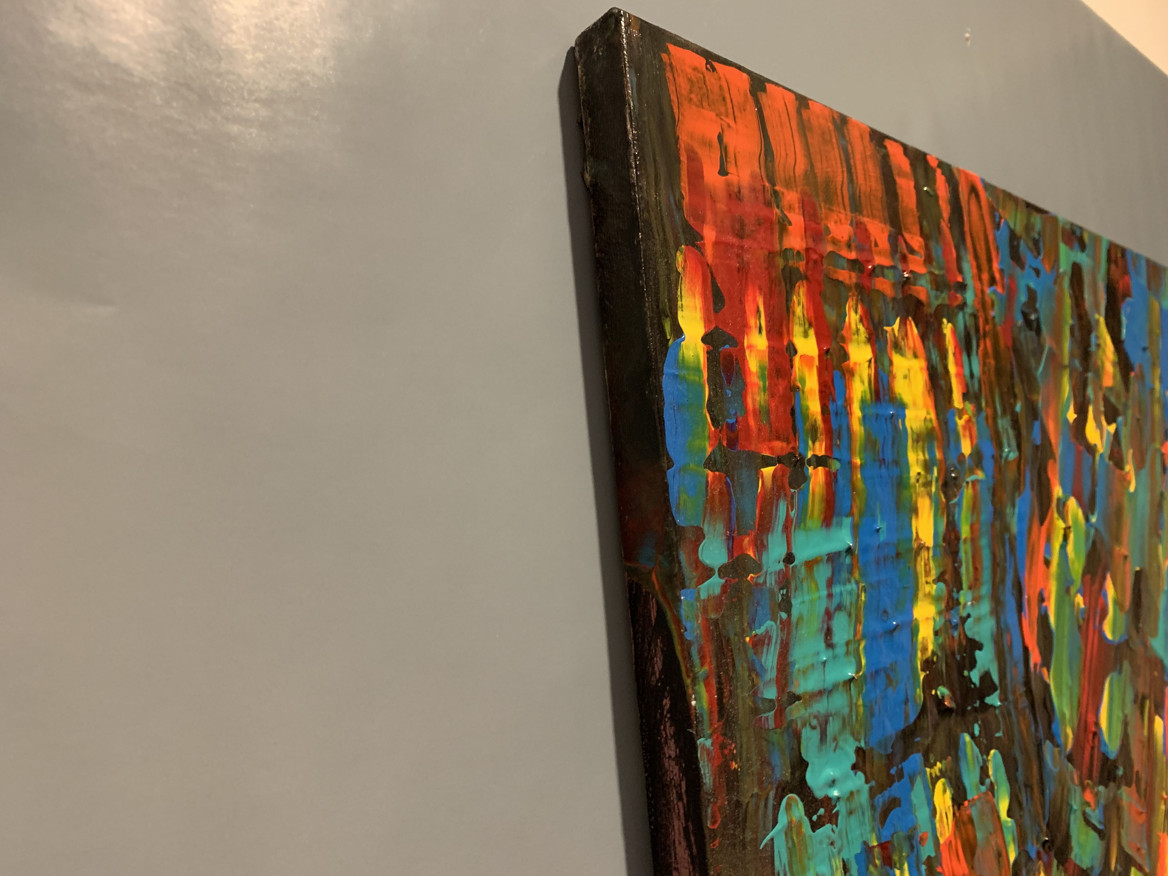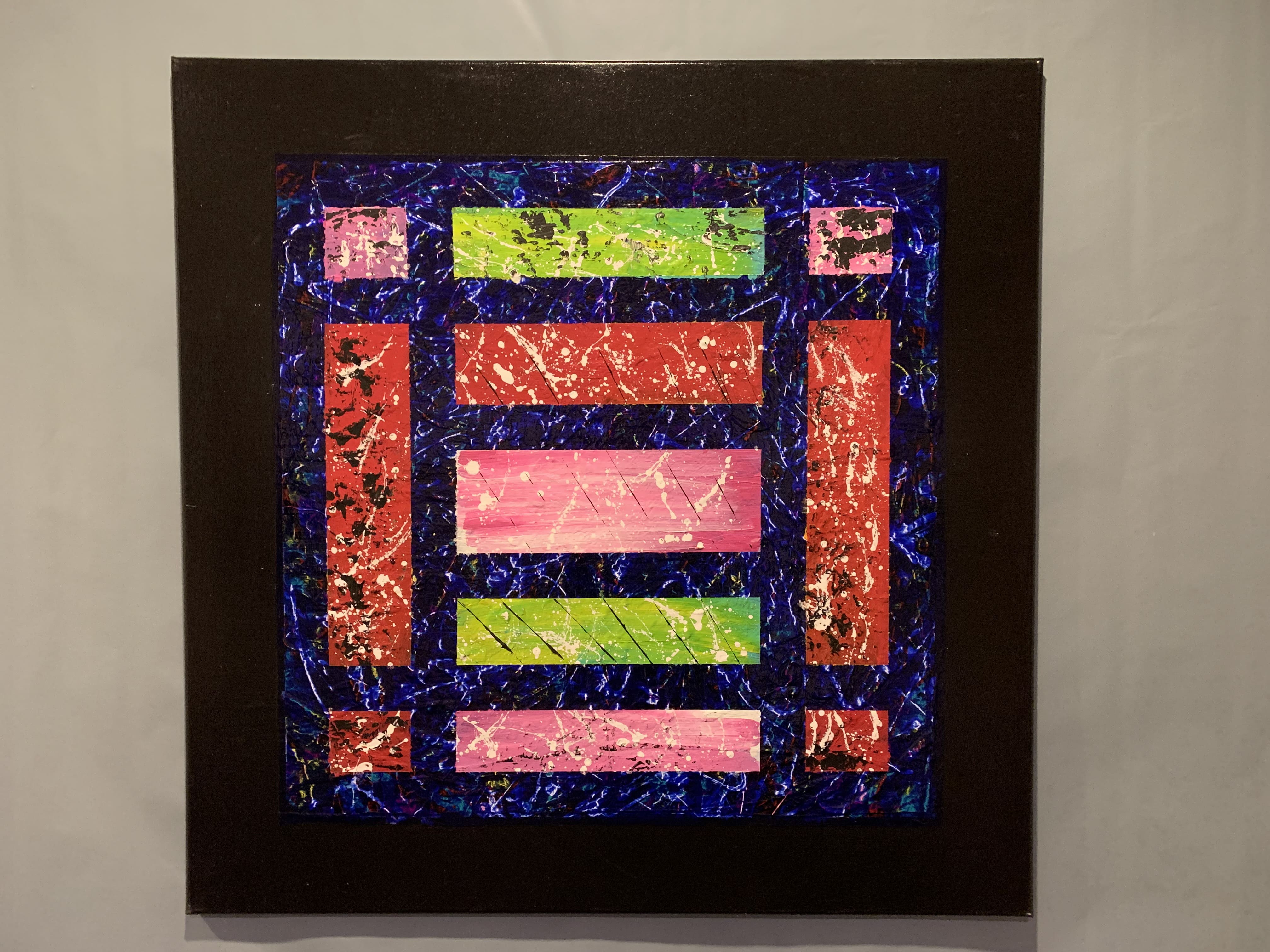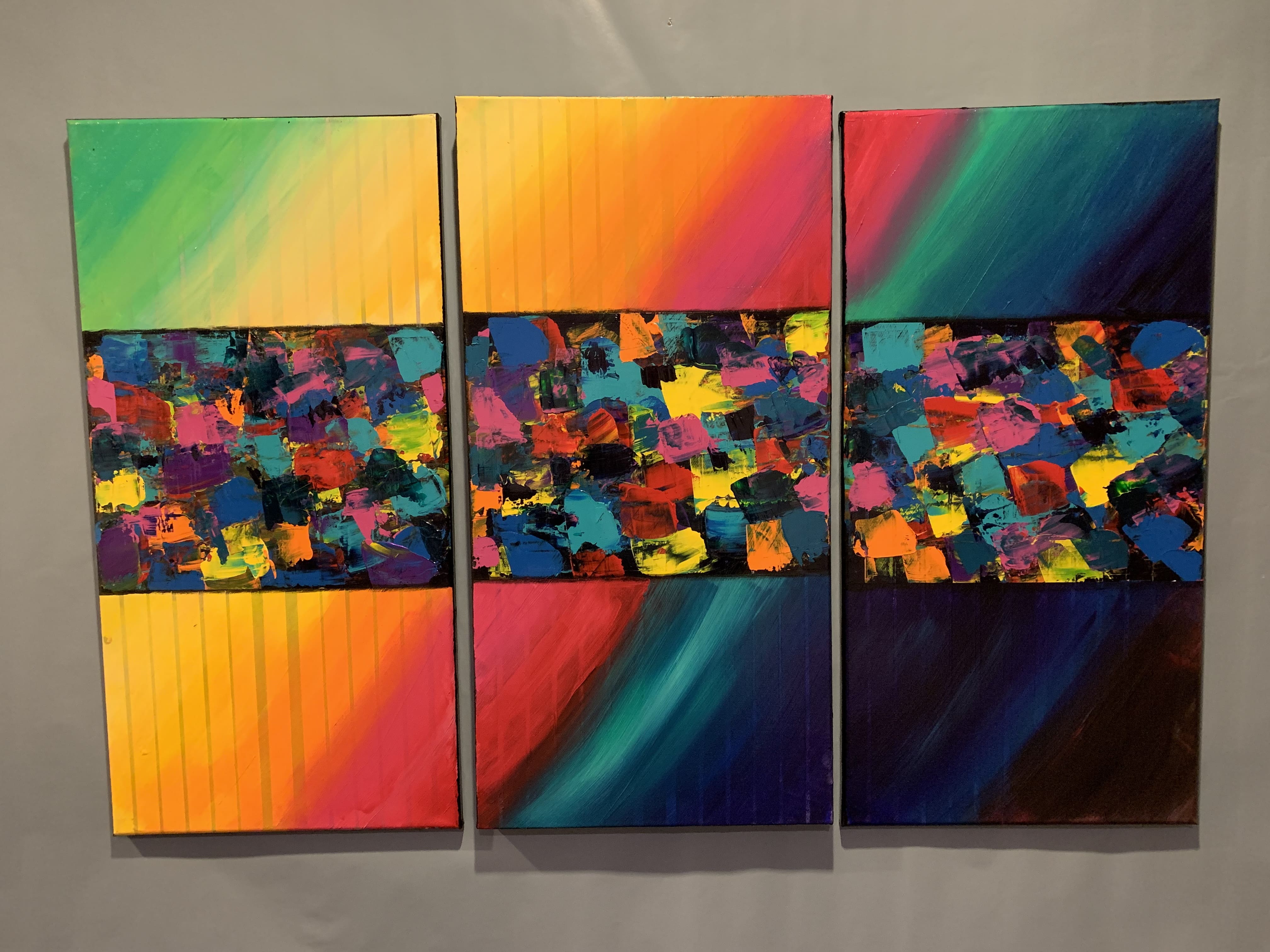 All paintings are on stretched canvas with acrylic base coat and a variety of acrylic paint techniques applied. Sealed with a gloss resin or varnish.